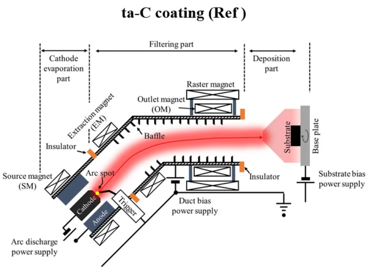 Let’s examine modern manufacturing techniques involving hot plasma and evaporation-based carbon deposition [2]. This publication describes a multitude of possible techniques; however, it concludes that Filtered Cathodic Vacuum Arc (FCVA) is the most efficient method to synthesise coherent thin films. In this process, a carbon target is treated like a cathode. Between it and the anode—separated by a few centimetres—a voltage of around 100V is applied to create an ionised carbon+ plasma. By adding the filtered component, which removes the occasionally ejected pieces of cathode material, deposition onto the substrate can be of high purity and quality.