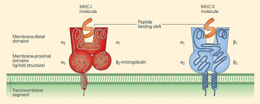 We already learned how protein mutations - associated with cancer - found inside the cell can alert the immune system. Proteins inside the cell are routinely chopped up, and their fragments, peptides 8–11 amino acids long, are exposed on the cell surface within a structure resembling a vice or a grip called MHC: major histocompatibility complex. MHC plus peptide is a pMHC. These peptides are sniffed by the immune system.
